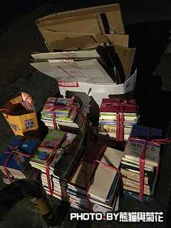 然後他還一邊退貨,一邊掏心掏肺地跟我講,大家越來越不看書囉,他們現在賣二手書也是靠硬撐的,巴拉巴拉(下刪3000句甘苦談)。最後我拿到180元的賣書錢,把其他被退貨的書帶回家拍照做紀念,等垃圾車來的時候,都拿去資源回收了。